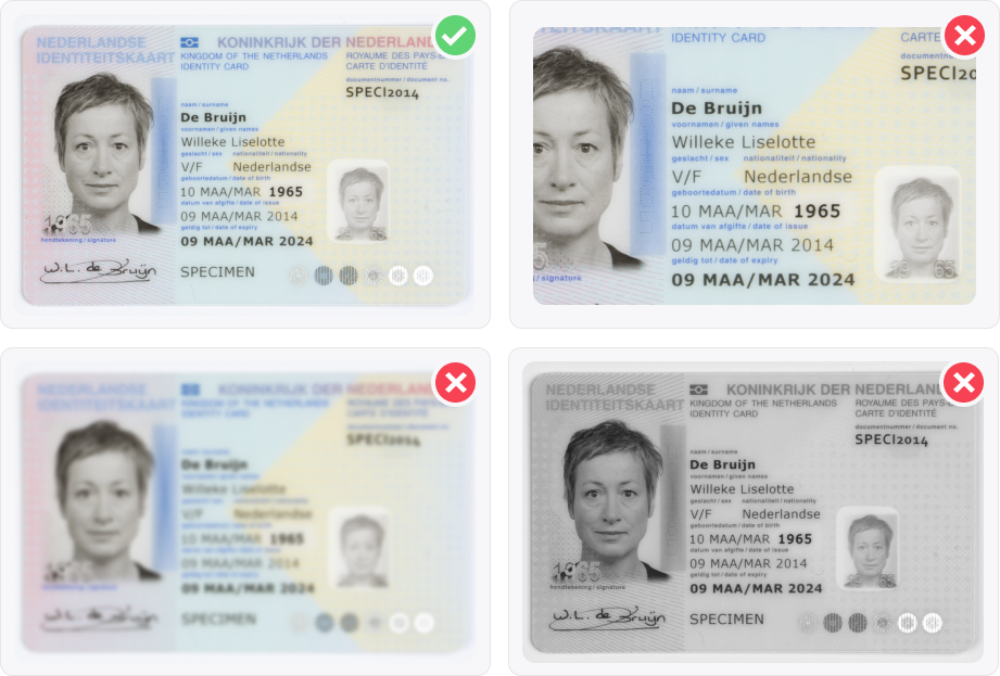 - Bottom right image: picture is black and white and document cannot be validated as authentic (security features not visible)